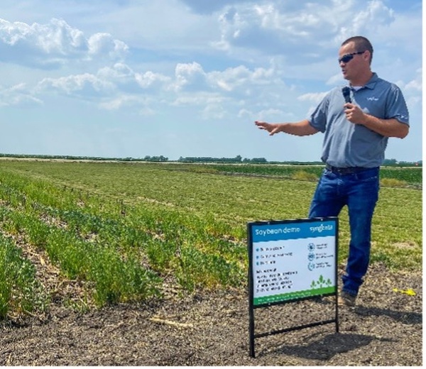 Syngenta Agronomic Research Scientist Brad Bernhard briefs visitors at one of the Syngenta regenerative agriculture field demos on the importance of ‘relay cropping’ with camelina so farmers can reap the benefits of this practice without delaying their regular planting timelines.